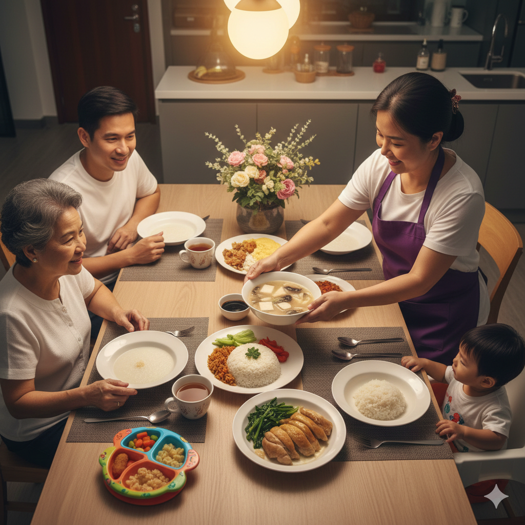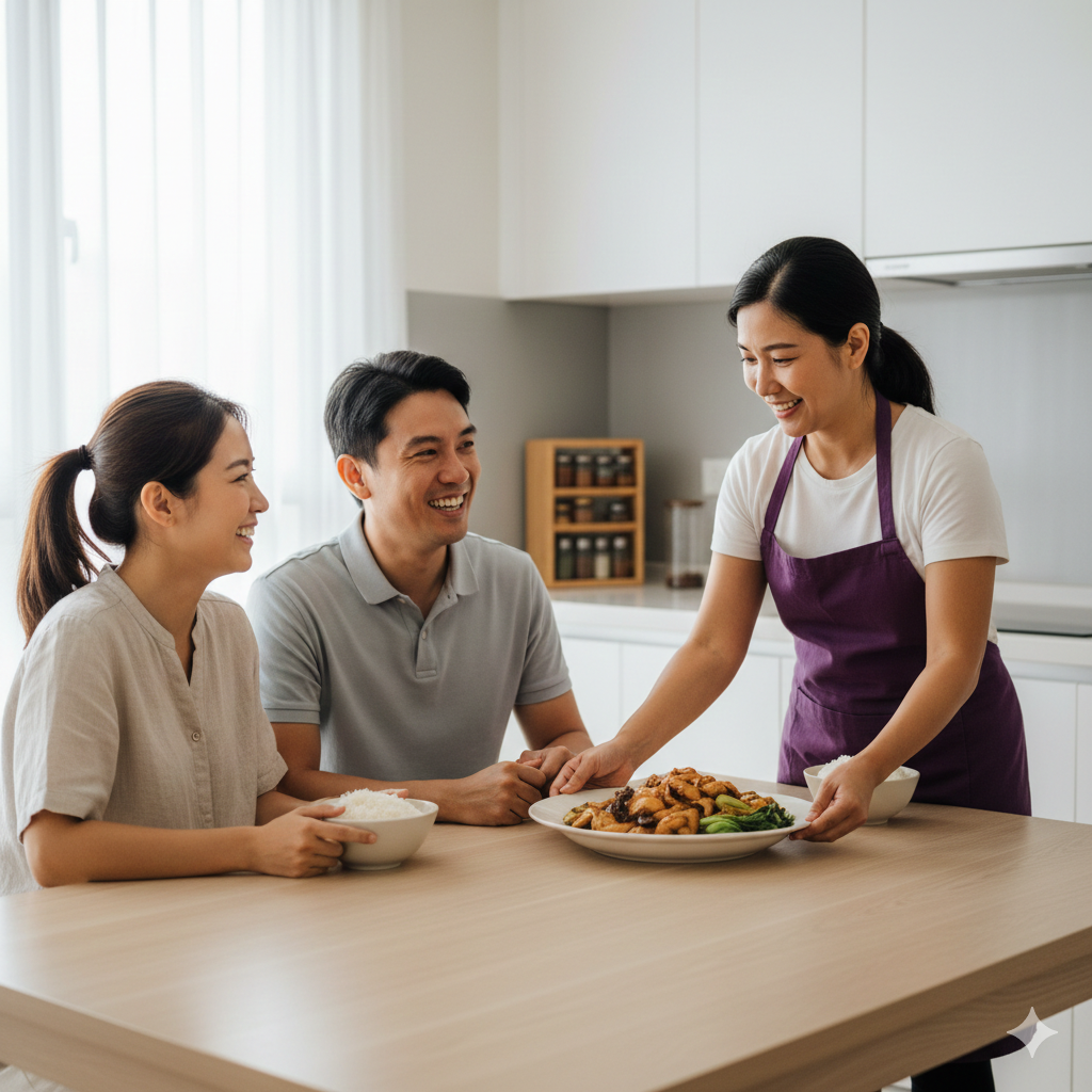 A 2024 study published in Family Relations found that working mothers in Singapore actively manage meal preparation through structured delegation strategies. In other words, handing over cooking to a helper is not a shortcut. It is a practical system that families build over time.